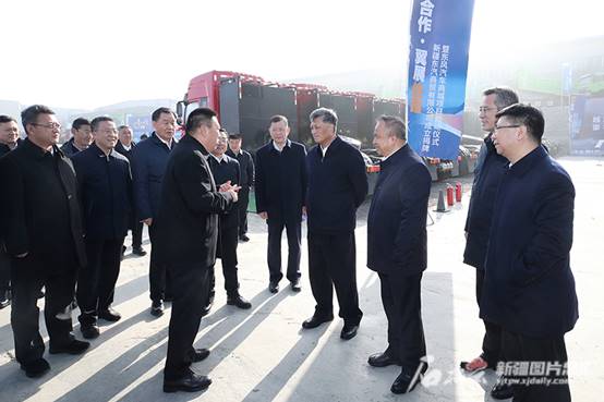 12月2日,自治区党委书记马兴瑞、自治区主席艾尔肯·吐尼亚孜等在新疆东汽商贸有限公司,实地察看汽车展示、听取工作介绍。石榴云/新疆日报记者崔志坚摄