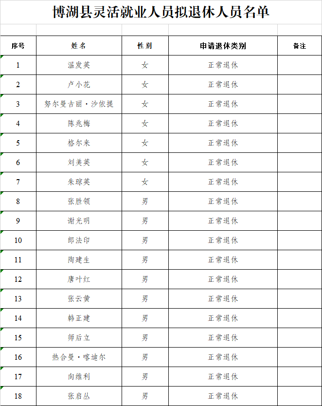 依据《关于渐进式延迟法定退休年龄的办法》《实施弹性退休制度暂行办法》(人社部发〔2024〕94号)文件精神,根据温发英等18名灵活就业人员提交的退休申请,现对其进行公示。公示期自2025年9月18日至9月24日,共7天。在公示期间,若对公示对象情况有异议的,可进行反映。