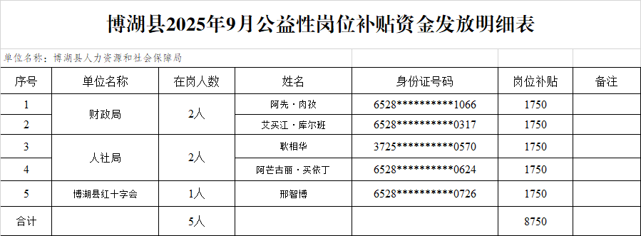 根据《关于进一步做好公益性岗位开发管理有关工作的通知》(新人社发〔2020〕8号)第五条第一项“岗位补贴标准原则上不高于当地最低工资标准”和《关于调整新疆维吾尔自治区最低工资标准的通知》(新政发〔2024〕66号)第二条“博湖县最低工资标准为1750元/月”的要求,现将5名公益性岗位财政补贴资金发放情况进行公示: