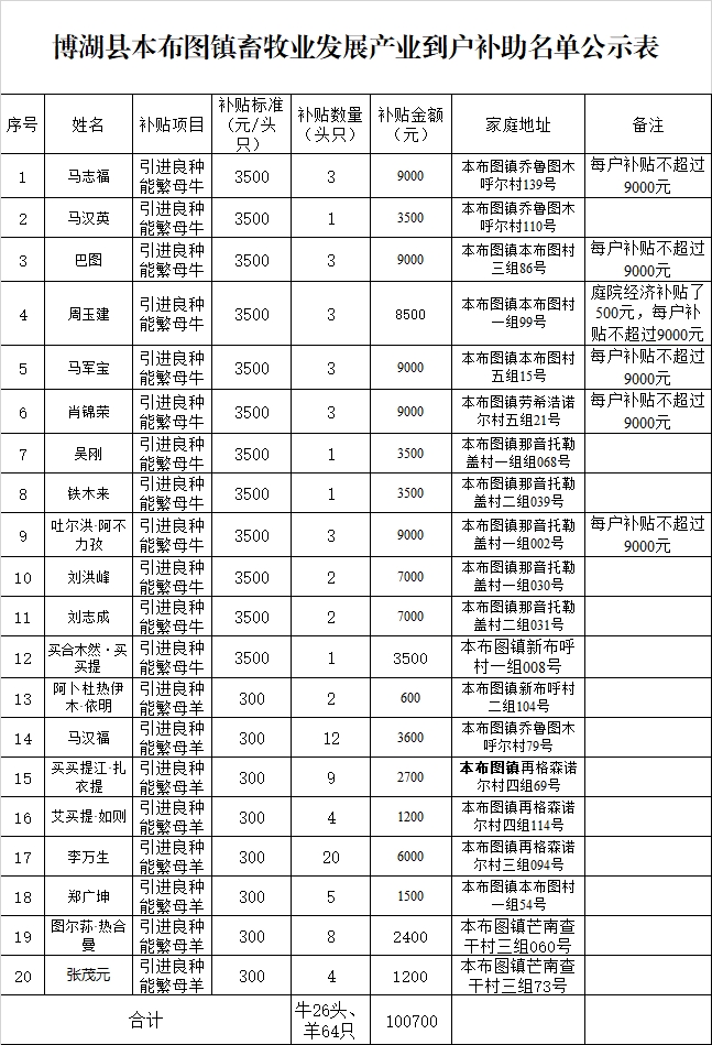 县农业农村局组织人员按照25%的比例对本布图镇马刘洪峰等5户脱贫户、监测对象进行畜牧业生产发展产业到户项目抽验。塔温觉肯乡共补助20户脱贫户、监测对象,补贴新购良种母牛26头,新购良种母羊64只,补贴金额为10.07万元。经现场抽验,情况属实,符合补助条件和要求,拟发放补助资金共计10.07万元。