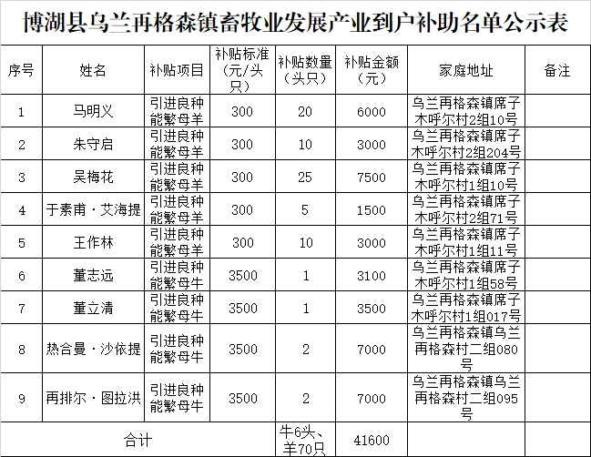 县农业农村局组织人员按照33%的比例对乌兰再格森镇董立清等3户脱贫户、监测对象进行畜牧业生产发展产业到户项目抽验。乌兰再格森镇共补助9户脱贫户、监测对象,补贴新购良种母牛6头,新购良种母羊70只,补贴金额为4.16万元。经现场抽验,情况属实,符合补助条件和要求,拟发放补助资金共计4.16万元。