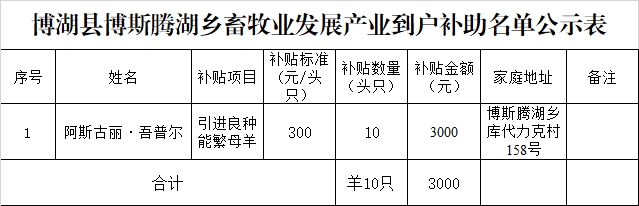 县农业农村局组织人员按照100%的比例对博斯腾湖乡脱贫户阿斯古丽·吾普尔家进行畜牧业生产发展产业到户项目抽验。博斯腾湖乡共补助1户脱贫户,新购良种母羊,10只,补贴金额为0.3万元。经现场抽验,情况属实,符合补助条件和要求,拟发放补助资金共计0.3万元。