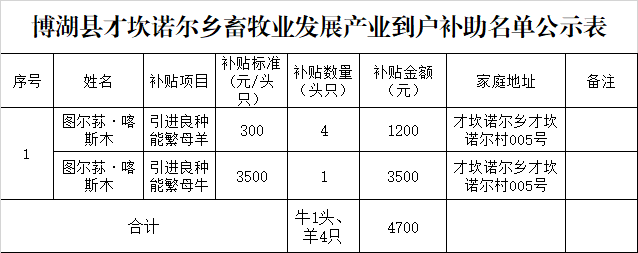 县农业农村局组织人员按照100%的比例对才坎诺尔乡脱贫户图尔荪·喀斯木家进行畜牧业生产发展产业到户项目抽验。才坎诺尔乡共补助1户脱贫户,补贴新购良种母羊4只、良种母牛1头,补贴金额为0.47万元。经现场抽验,情况属实,符合补助条件和要求,拟发放补助资金共计0.47万元。