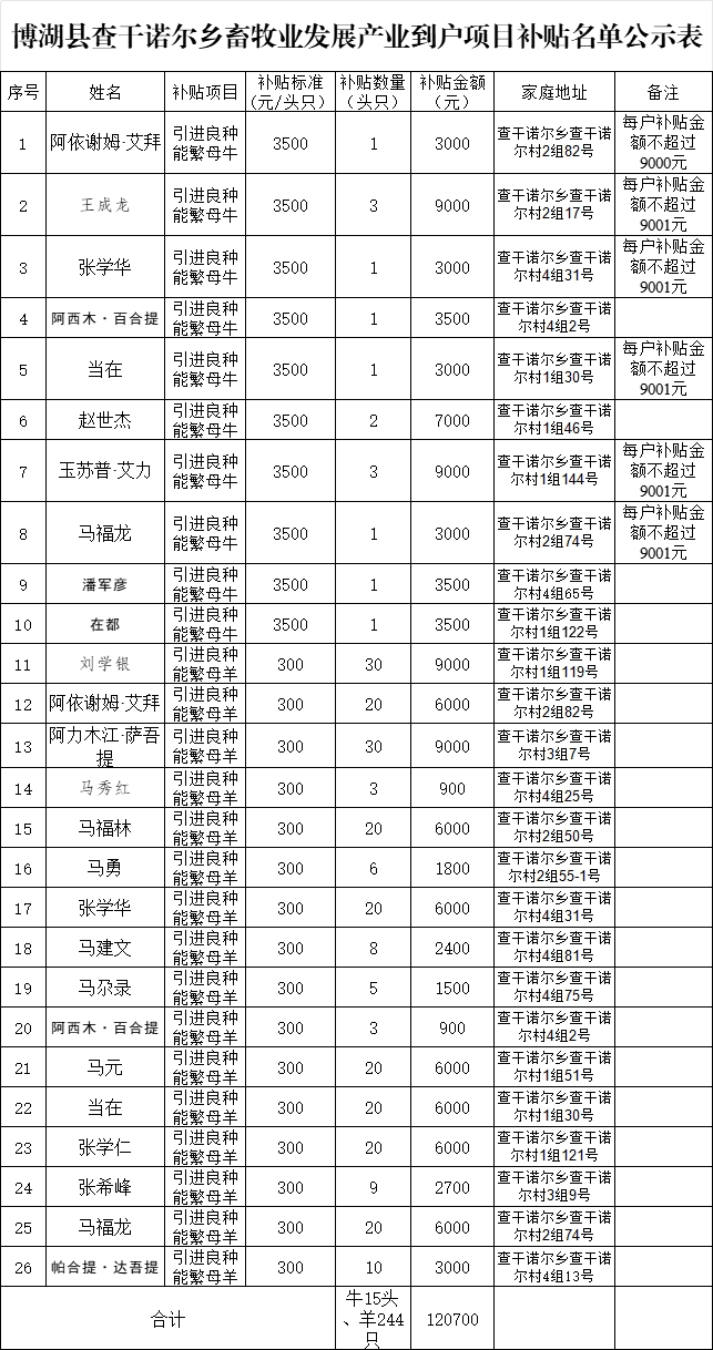 县农业农村局按照19%的比例对查干诺尔乡张希峰等5户脱贫户、监测对象进行畜牧业生产发展产业到户项目抽验。查干诺尔乡共补助26户,补贴新购良种母牛15头、新购良种母羊244只,补贴金额为12.07万元。经现场抽验,情况属实,符合补助条件和要求,拟发放补助资金共计12.07万元。