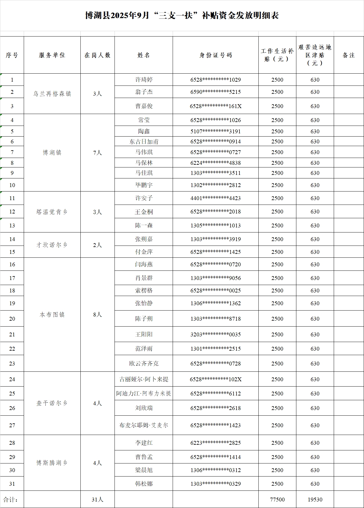 根据《关于实施自治区第四轮高校毕业生“三支一扶”计划的通知》(新人社规〔2021〕30号)文件要求,现将31名“三支一扶”财政补贴资金发放情况进行公示: