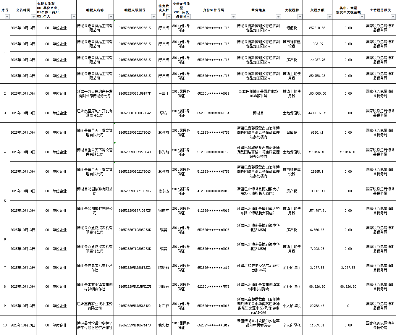 附件:国家税务总局博湖县税务局2025年第三季度10户纳税人欠税情况清册