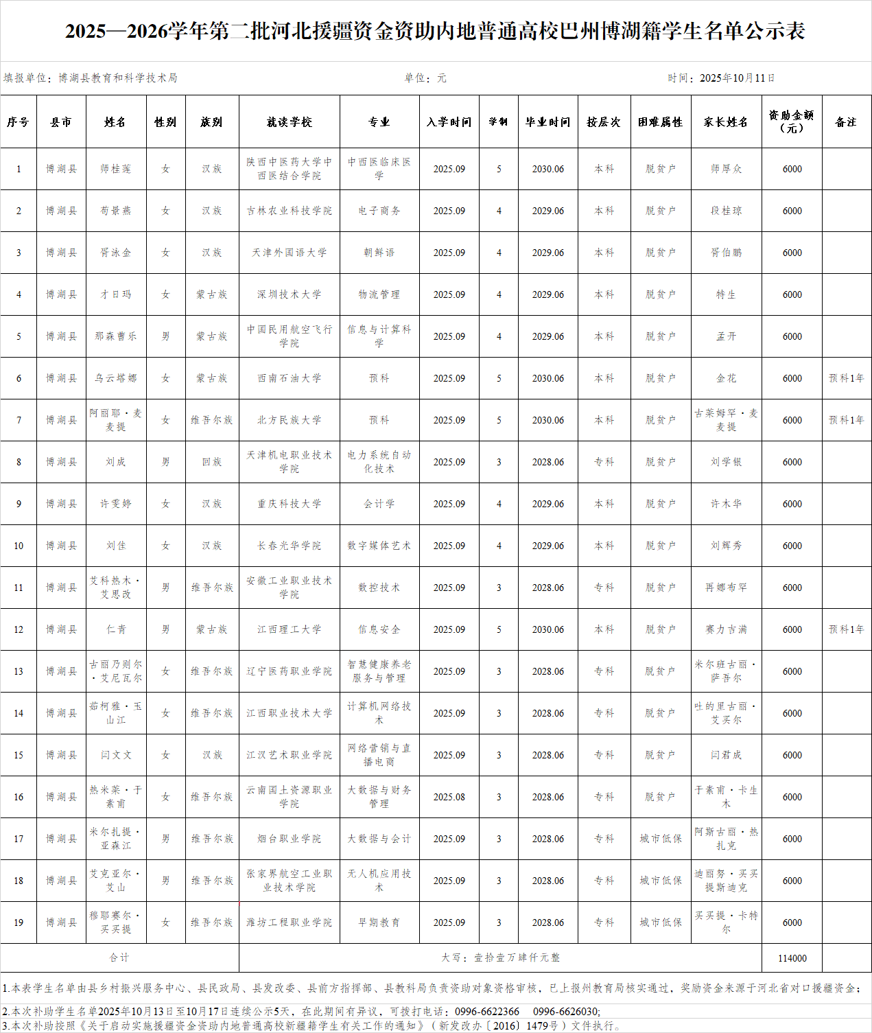 根据《关于启动实施援疆资金资助内地普通高校新疆籍学生有关工作的通知》(新发改办〔2016〕1479号)文件精神,经过层层把关筛选,并报送县乡村振兴服务中心、县民政局审核确认无误,现将符合资助条件的19名学生名单予以公示,公示期限5天(2025年10月13日起至2025年10月17日止),公示期间如有异议,请通过正规方式和途径向博湖县教育和科学技术局举报。