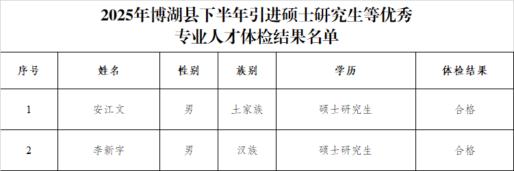 附件:2025年博湖县下半年引进硕士研究生等优秀专业人才体检结果名单