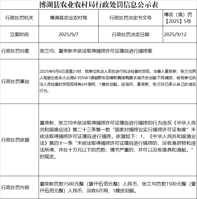 博湖县农业农村局行政处罚信息公示表博农(渔)罚【2025】5号