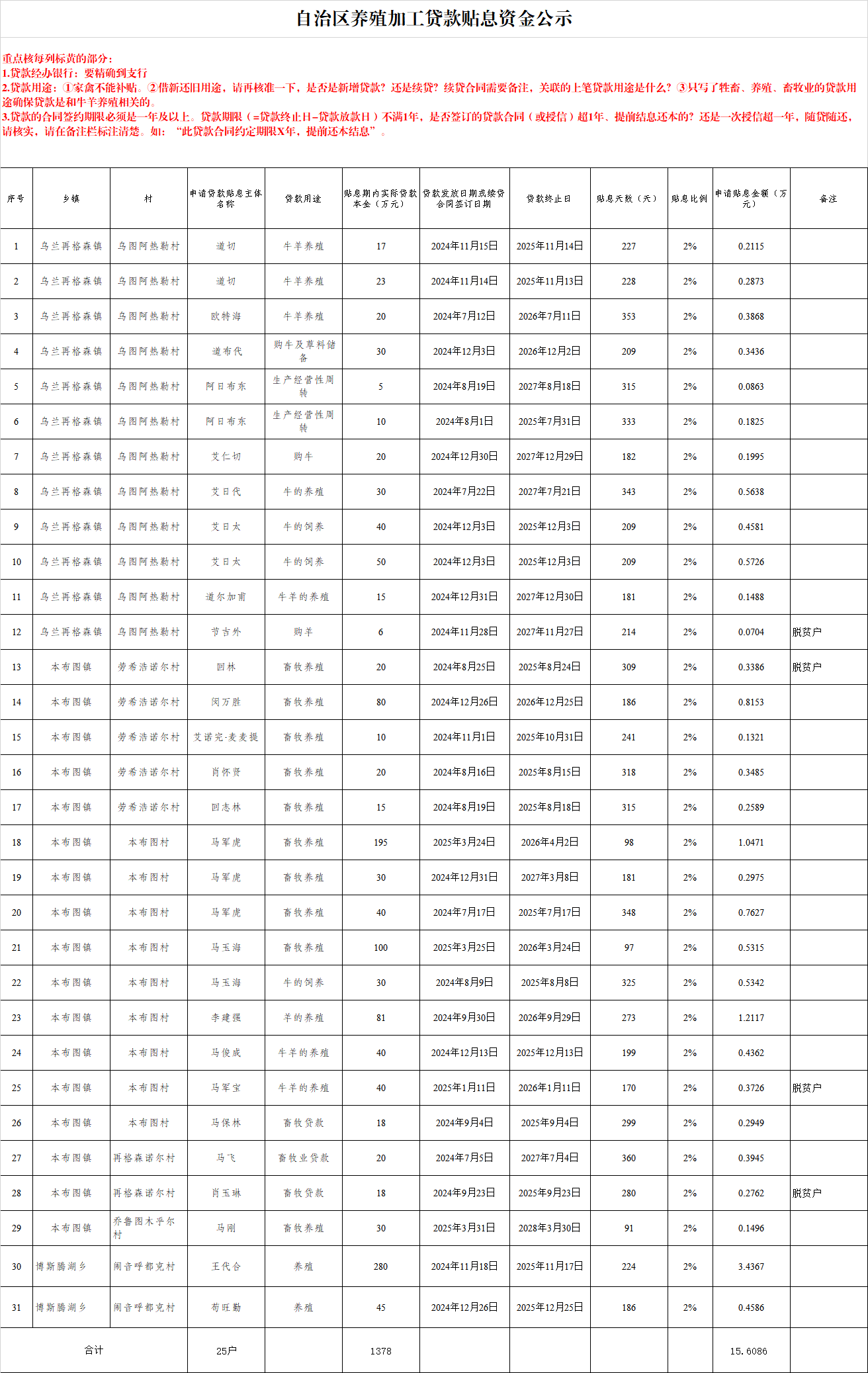 为贯彻落实《稳定肉牛肉羊及奶产业九条政策措施》(新政办发〔2024〕124号),进一步明确政策实施要点、补贴原则、补贴程序有关要求,推进养殖加工贷款贴息政策措施落地见效的要求,博湖县对2024年7月1日到2025年6月30日期间贷款的养殖户,经过养殖户申报,村委会核对相关信息并公示无异议后,上报乡镇人民政府。乡镇人民政府进行汇总核实后,按照20%的比例对申请贴息对象进行现场核查。核查通过后上报县农业农村和财政部门。县农业农村局和财政局联合给州农业农村局申请养殖贷款贴息资金的报告,州农业农村局上报到自治区农业农村厅,经自治区农业农村厅审核通过后,再下拨资金的程序。截止目前,我县3个乡镇共计申报了25家养殖户的1378万元,涉及补贴资金15.6086万元。按照相关规定在全县予以公示,详单附后,如有异议,可在公示期内向相关部门反映。