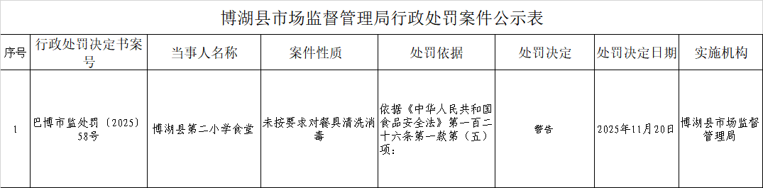 博湖县市场监督管理局行政处罚案件公示表巴博市监处罚〔2025〕58号