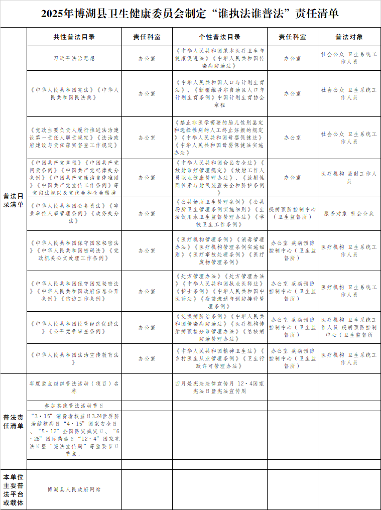 2025年博湖县卫生健康委员会制定“谁执法谁普法”责任清单