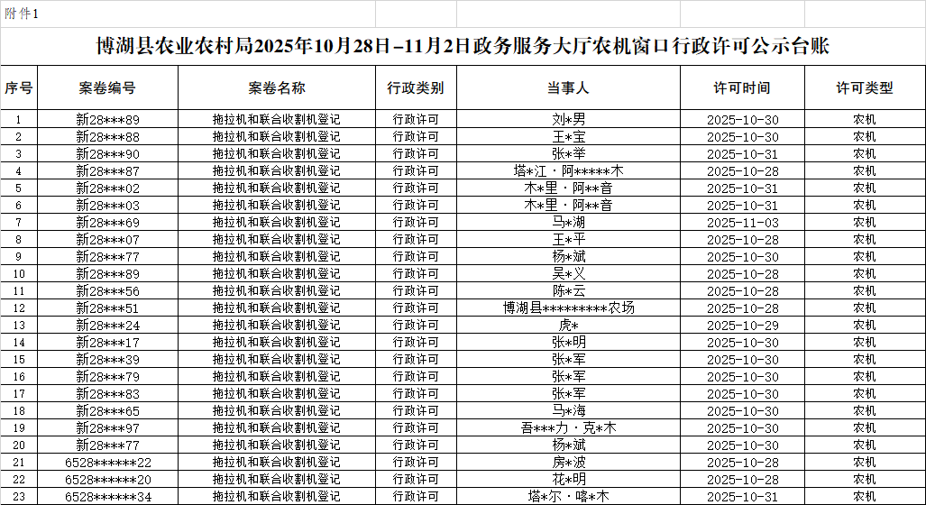 博湖县农业农村局2025年10月28日-11月2日政务服务大厅农机窗口行政许可公示台账