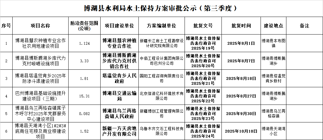 博湖县水利局水土保持方案审批公示(第三季度)