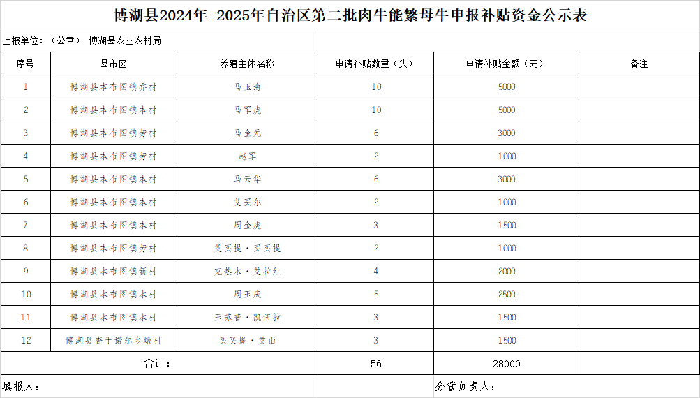 附件:1、博湖县2024年-2025年自治区第二批能繁母牛养殖补贴资金申报公示表(补报)