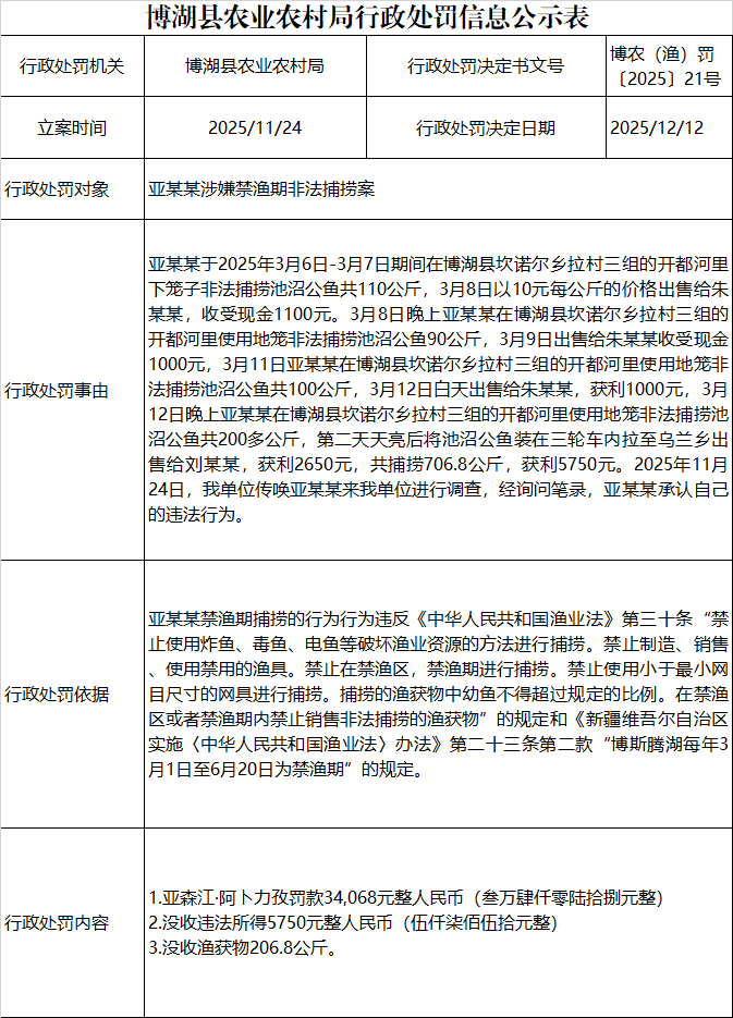 博湖县农业农村局行政处罚信息公示表博农(渔)罚〔2025〕21号