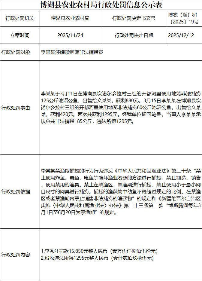 博湖县农业农村局行政处罚信息公示表博农(渔)罚〔2025〕19号