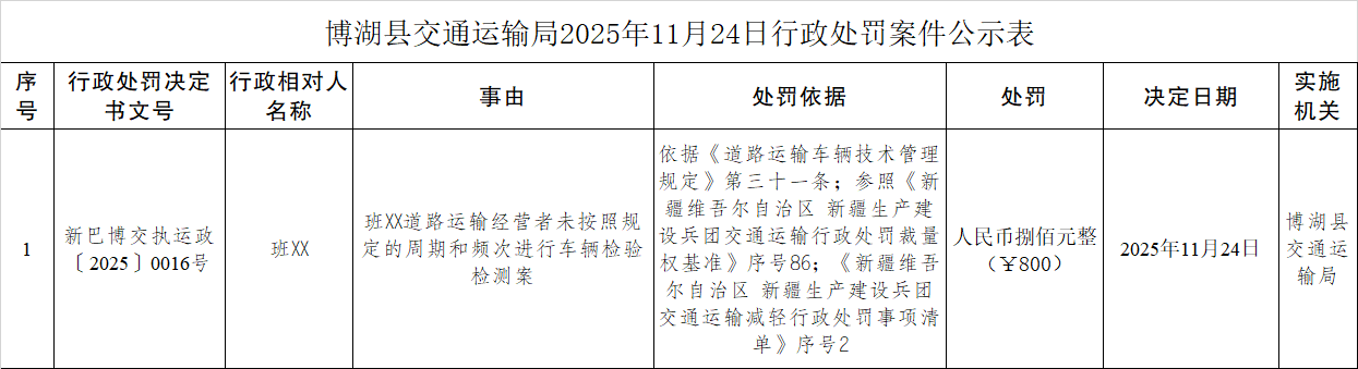 博湖县交通运输局2025年11月24日行政处罚案件公示表