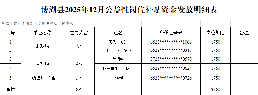 附件:博湖县2025年12月公益性岗位补贴资金发放明细表