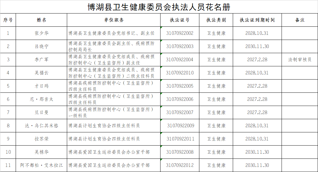 博湖县卫生健康委员会执法人员花名册