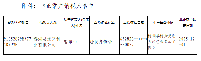 根据《国家税务总局关于进一步完善税务登记管理有关问题的公告》(国家税务总局公告〔2011年〕21号)文件规定,现将2025年12月认定为非正常户的纳税人情况予以公告。