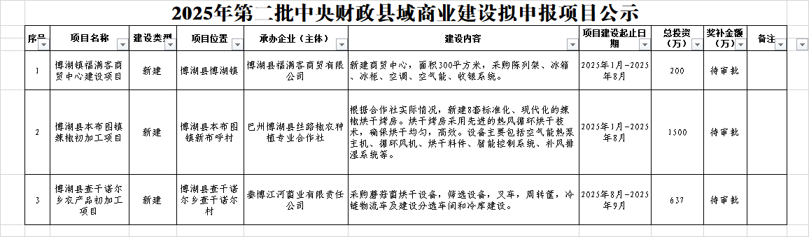 根据《财政部办公厅商务部办公厅国家乡村振兴局综合司关于支持实施县域商业建设行动的通知》(财办建〔2022〕18号)、《商务部等9部门办公厅(室)关于印发〈县域商业三年行动计划(2023-2025年)〉的通知》《新疆维吾尔自治区商务厅关于开展2025年(第二轮)县域商业建设行动项目申报工作的通知》,我县开展了2025年第二批县域商业建设行动项目遴选工作。按照公平、公开、公正的原则,拟申报博湖县查干诺尔乡农产品初加工项目,博湖县本布图镇辣椒初加工项目,博湖镇福满客商贸中心建设项目等3个项目为博湖县2025年度第二批县域商业建设行动项目,现予以公示。公示时间为5个工作日,如有异议,请与博湖县商工局联系。