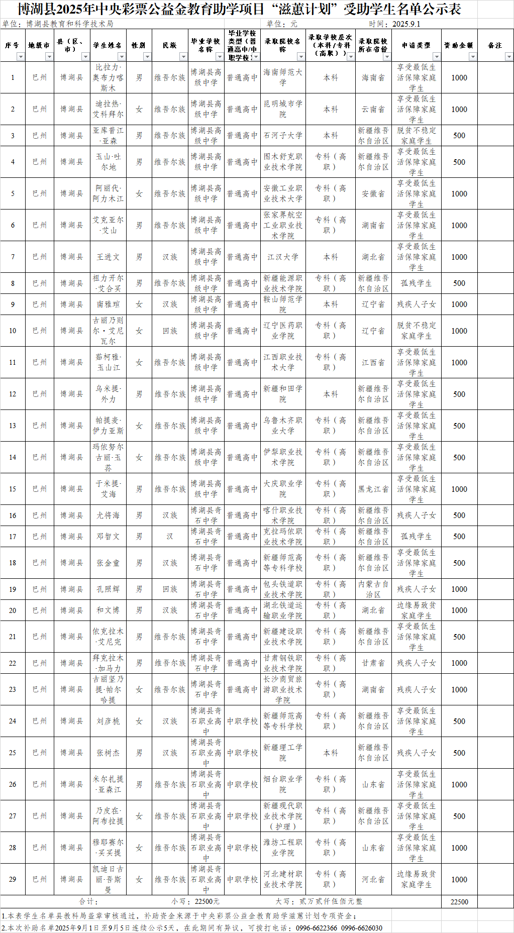 根据财政部教育部关于印发《中央彩票公益金教育助学项目资金管理办法》的通知(财教〔2022〕175号)文件精神要求,经学生本人申请,就读学校和县教科局审核,现确定将符合资助条件的比拉力·奥布力喀斯木等29名学生,为博湖县2025年中央专项彩票公益金教育助学项目“滋蕙计划”受助人员。现予公示,公示期限5天(2025年9月1日起至2025年9月5日止),公示期间如有异议,请通过正规方式和途径向博湖县教育和科学技术局举报。