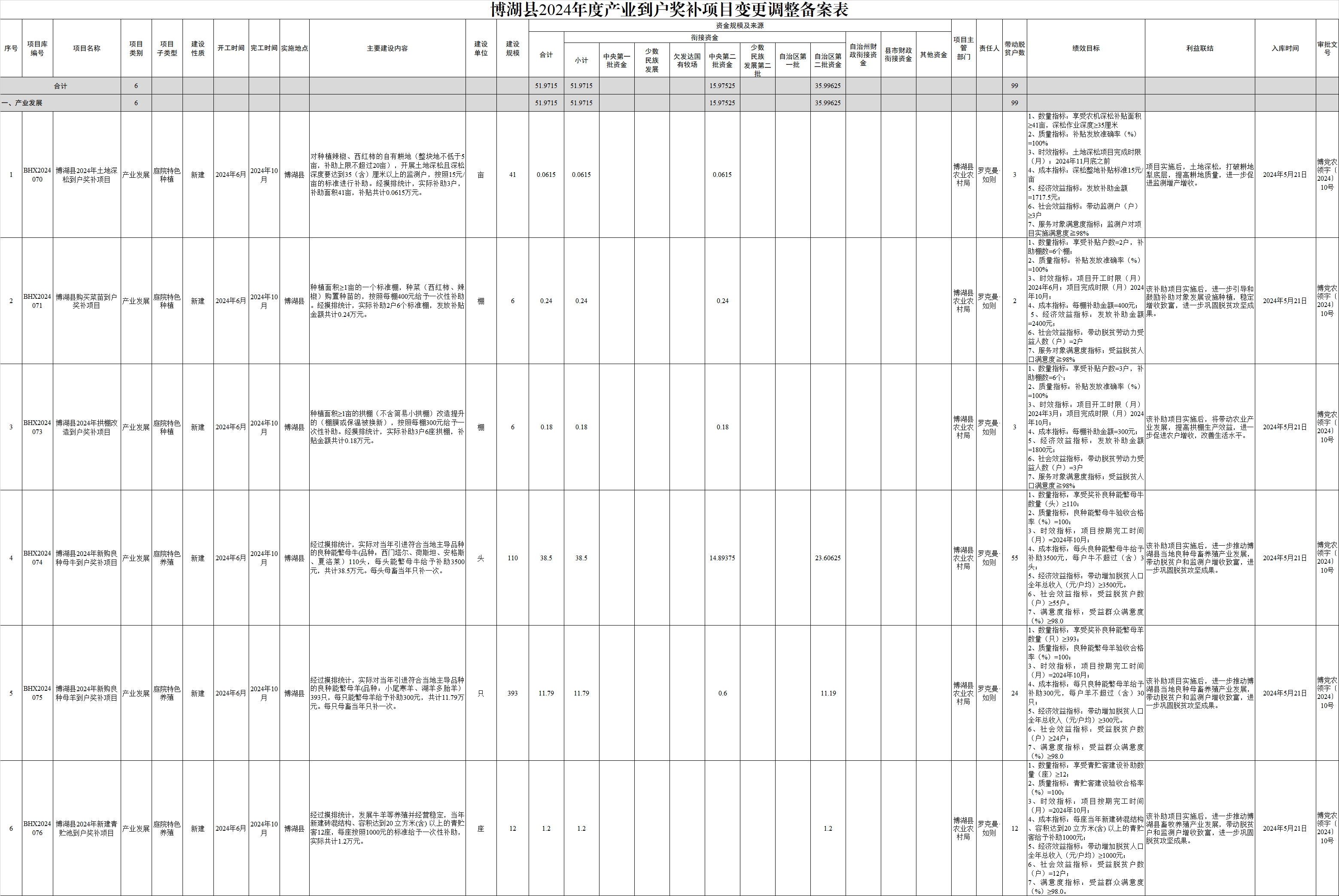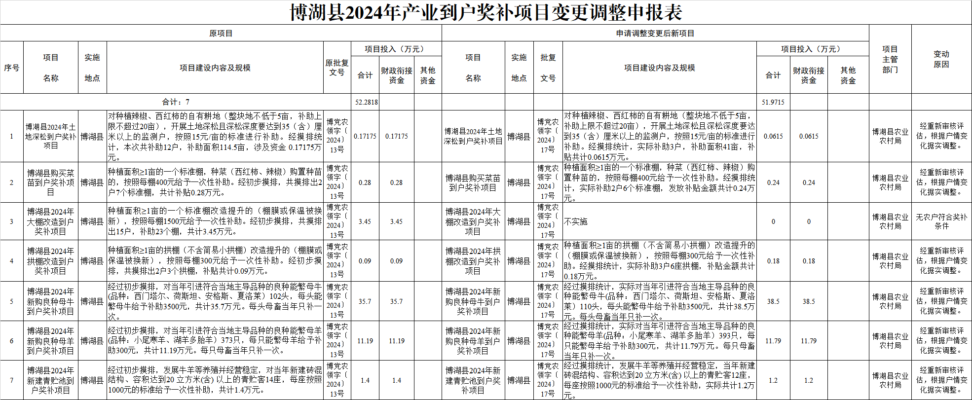 根据《关于2024年推动产业帮扶精准到户 促进农民持续增收有关工作的通知》(新财振〔2024〕6号)文件要求,在充分尊重帮扶对象意愿的基础上,切实发挥财政衔接资金引导作用。现依据到户产业奖补项目实际实施情况,经县委农村工作领导小组审议,决定将部分到户产业奖补项目进行调整变更,本次调整变更项目7个,涉及资金52.28175万元。现将调整变更情况予以公示公告,主动接受社会监督。