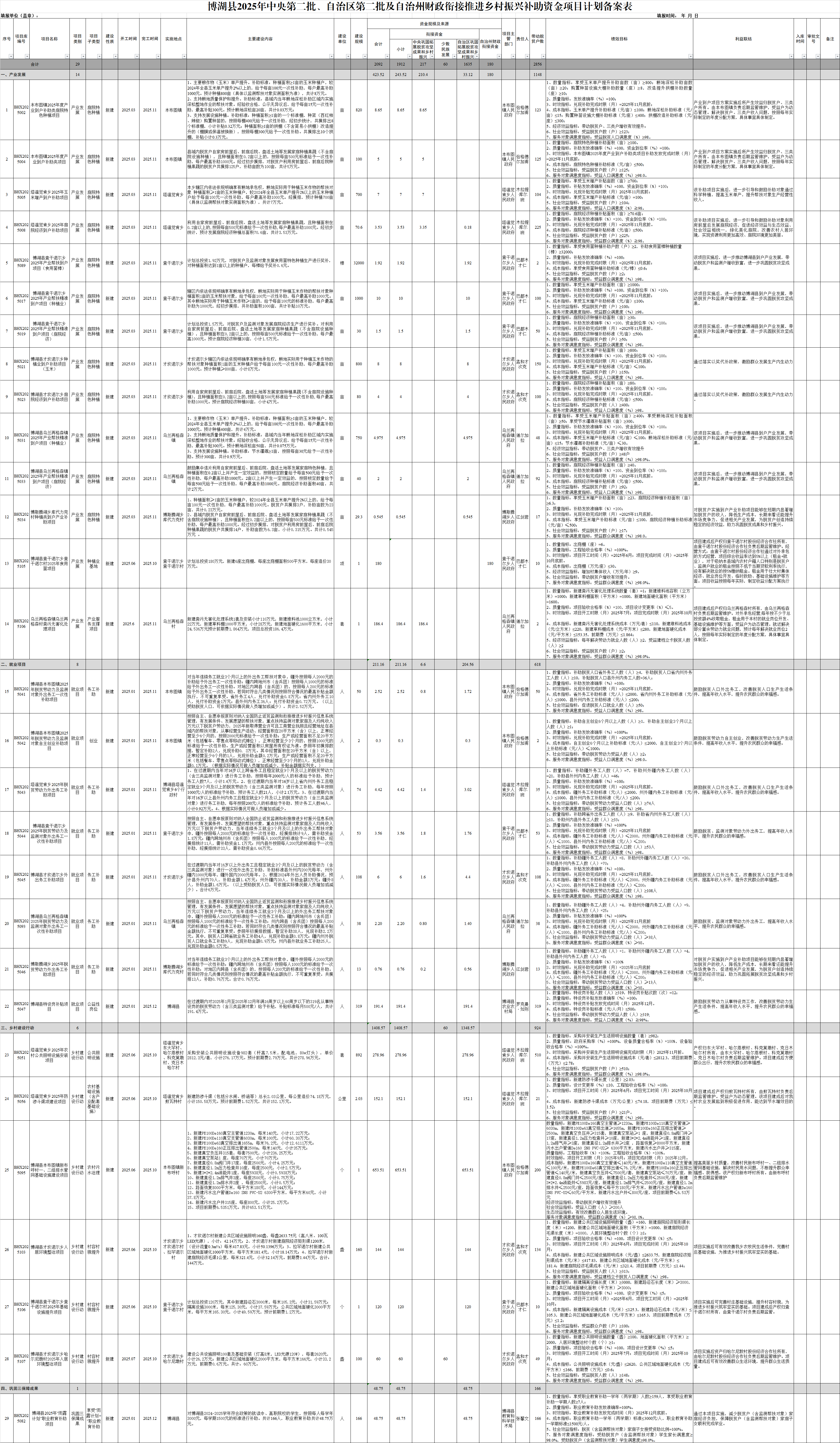 为做好2025年度中央第二批、自治区第二批及自治州财政衔接推进乡村振兴补助资金项目计划安排,博湖县委农村工作领导小组办公室、县财政局按照巩固拓展脱贫攻坚成果和衔接推进乡村振兴相关规划,紧紧围绕牢牢守住不发生规模性返贫底线任务,突出巩固拓展产业类项目,健全完善利益联结机制,稳妥推进乡村建设,着力解决重点示范村短板弱项,聚焦衔接乡村振兴和高质量发展,深入各乡镇村实地调查研究,充分征求县直有关行业部门意见,并结合《关于提前下达2025年中央财政衔接推进乡村振兴补助资金预算的通知》(博财农〔2024〕19号)《关于2024年推动产业帮扶精准到户促进农民持续增收有关工作的通知》(新财振〔2024〕6号)文件要求,认真筛选编制了博湖县2025年度中央第二批、自治区第二批及自治州财政衔接推进乡村振兴补助资金项目计划。此次项目计划拟申报项目共计29个,涉及资金2092万元,其中,中央第二批财政衔接资金到位277万元(含中央巩固拓展脱贫攻坚成果和乡村振兴任务资金217万元,少数民族发展资金60万元),自治区第二批财政衔接资金到位1635万元,自治州财政衔接资金到位180万元。经县委农村工作领导小组审定通过,现予以公示公告,接受社会监督。
