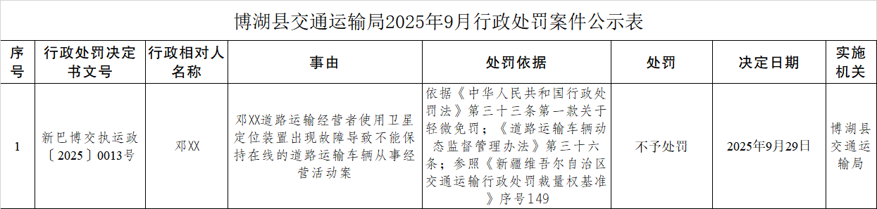 博湖县交通运输局2025年9月行政处罚案件公示表