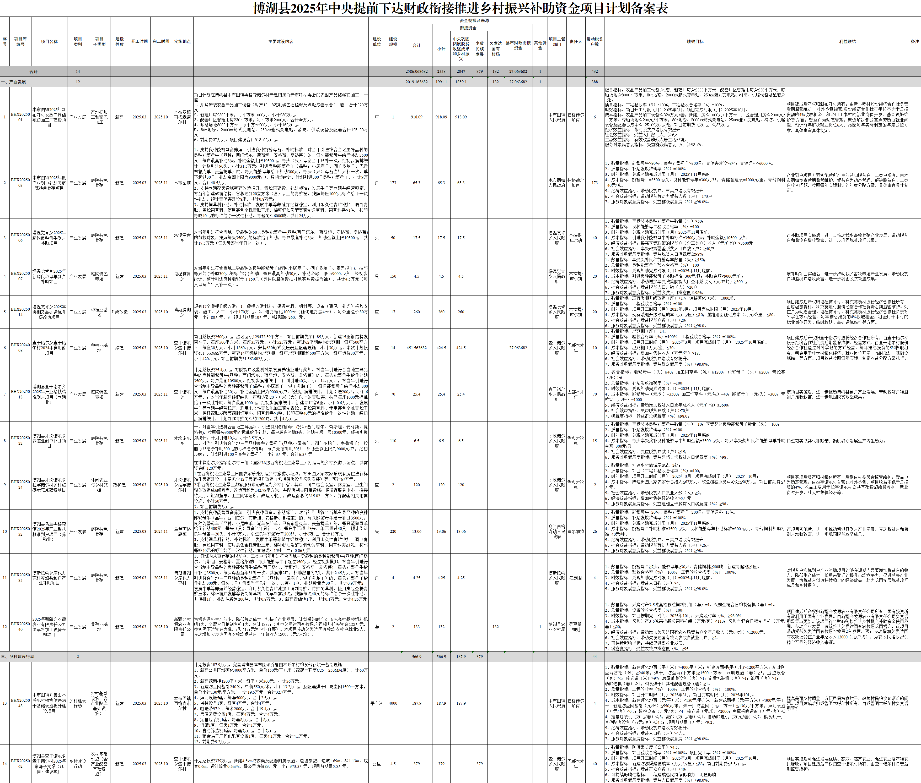 为做好2025年中央提前下达财政衔接推进乡村振兴补助资金管理使用和项目计划安排,博湖县委农村工作领导小组办公室、县财政局按照巩固拓展脱贫攻坚成果和衔接推进乡村振兴相关规划,紧紧围绕牢牢守住不发生规模性返贫底线任务,突出巩固拓展产业类项目,健全完善利益联结机制,稳妥推进乡村建设,着力解决重点示范村短板弱项,聚焦衔接乡村振兴和高质量发展,深入各乡镇村实地调查研究,充分征求县直有关行业部门意见,并结合《关于提前下达2025年中央财政衔接推进乡村振兴补助资金预算的通知》(博财农〔2024〕19号)《关于2024年推动产业帮扶精准到户促进农民持续增收有关工作的通知》(新财振〔2024〕6号)文件要求,认真筛选编制了博湖县2025年中央提前下达财政衔接推进乡村振兴补助资金项目计划。此次项目计划拟申报项目共计14个,涉及资金2586.063682万元,其中,中央提前下达财政衔接资金2558万元,县级财政衔接资金27.063682万元,其他资金1万元,包含产业发展项目12个,涉及资金2019.163682万元;乡村建设行动项目2个,涉及资金566.9万元。经县委农村工作领导小组审定通过,现予以公示公告,接受社会监督。