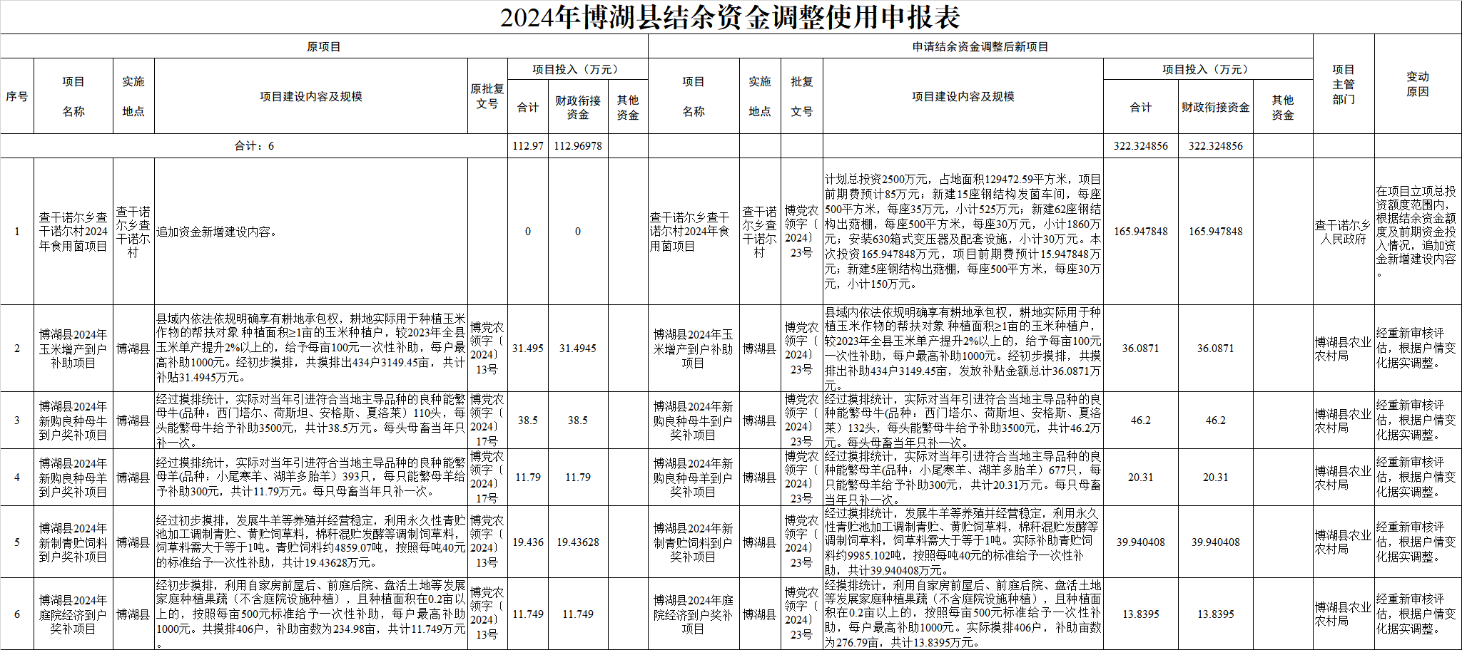 根据《关于加强财政衔接推进乡村振兴补助资金使用管理的指导意见》(新财振〔2022〕5号)《关于进一步加强财政衔接推进乡村振兴补助资金使用管理的补充通知》(新财振〔2024〕1号)等文件规定,结合我县财政衔接结余资金管理实际及项目落实情况,由县委农村工作领导小组办公室、财政局牵头,组织相关乡镇及部门,认真筛选编制了博湖县2024年度结余资金项目计划6个,涉及资金322.324856万元(包含项目原投入资金112.96978万元,结余资金投入使用209.355076万元)。其中,中央提前下达财政衔接资金115.473799万元、少数民族发展资金30.232363万元、中央第二批财政衔接资金47.0985万元、自治区提前下达财政衔接资金63.338664万元,自治区第二批财政衔接资金66.18153万元。现将该批结余资金项目计划予以公示公告,主动接受社会监督。