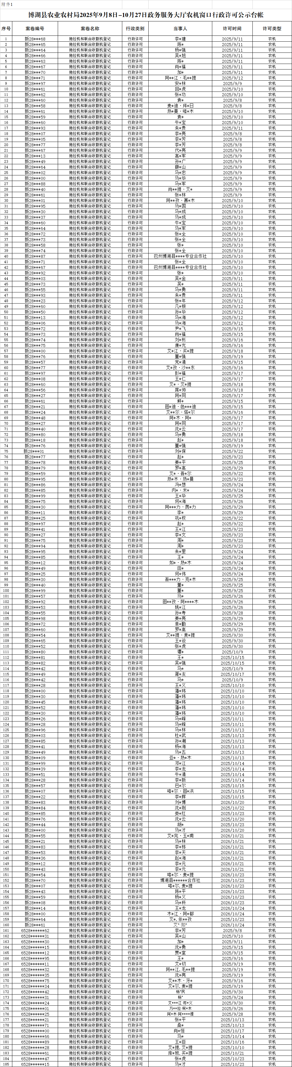 博湖县农业农村局2025年9月8日-10月27日政务服务大厅农机窗口行政许可公示台帐
