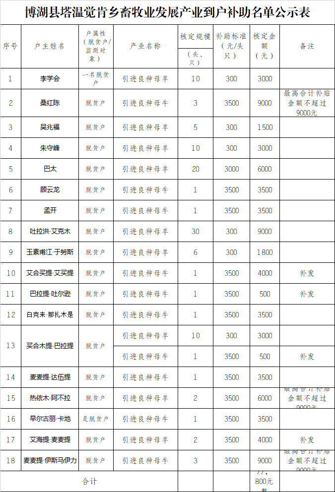县农业农村局组织人员按照22%的比例对塔温觉肯乡桑红陈等4户脱贫户、监测对象进行畜牧业生产发展产业到户项目抽验。塔温觉肯乡共补助18户脱贫户、监测对象,补贴新购良种母牛19头,新购良种母羊91只,补贴金额为7.78万元。经现场抽验,情况属实,符合补助条件和要求,拟发放补助资金共计7.78万元。