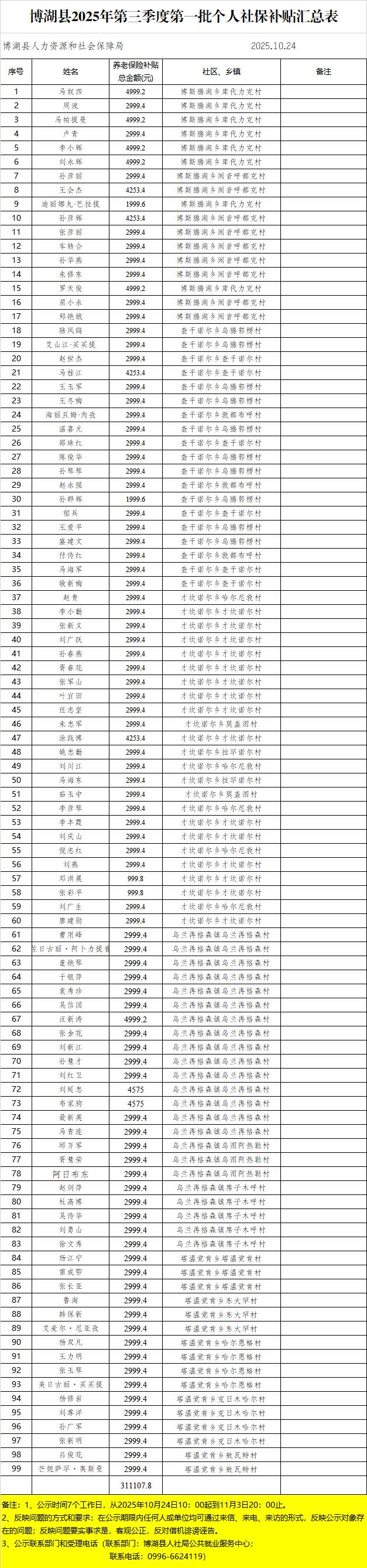 10月24日将博湖县2025年第三季度第一批次享受灵活就业社保补贴、自主创业社保补贴人员名单进行公示,符合灵活就业社保补贴、自主创业社保补贴发放条件的共99人,申请补贴资金311,107.8元。