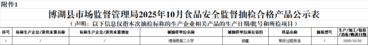 附件1:博湖县市场监督管理局2025年10月食品安全监督抽检合格产品公示表