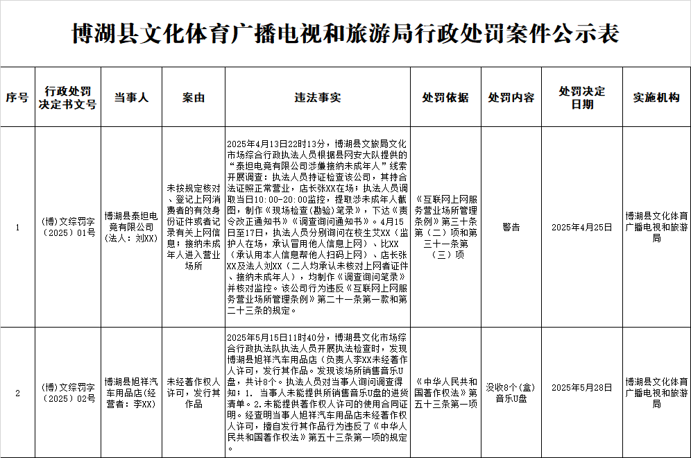 博湖县文化体育广播电视和旅游局行政处罚案件公示表