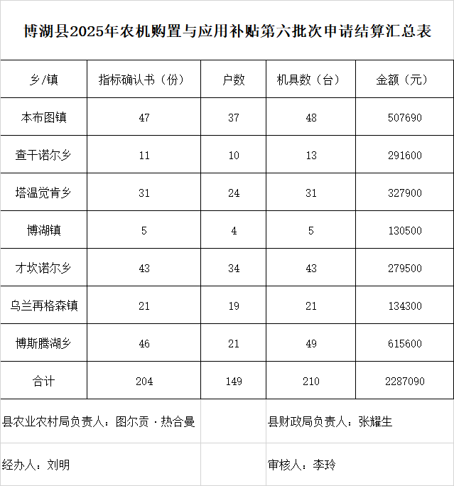 经农户申请和各相关乡镇、县农业农村局、县财政局审核,博湖县2025年第六批共补贴新购农机具210台、受益户149户、发放新购农机具补贴资金228.709万元。现予以公示,如有异议,可在5日内向博湖县农业农村局或相关部门反映。