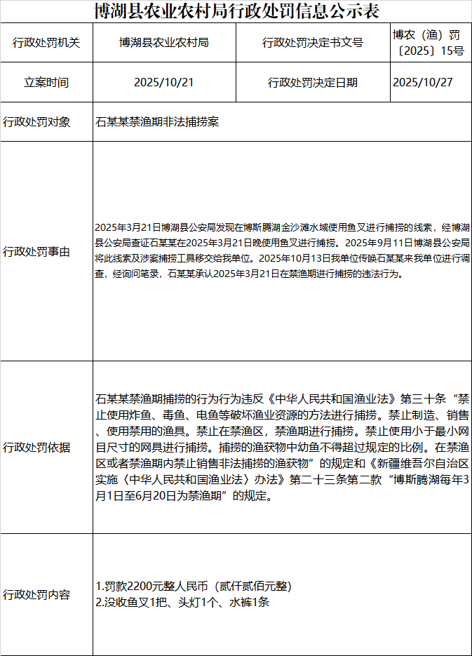 博湖县农业农村局行政处罚信息公示表博农(渔)罚〔2025〕15号
