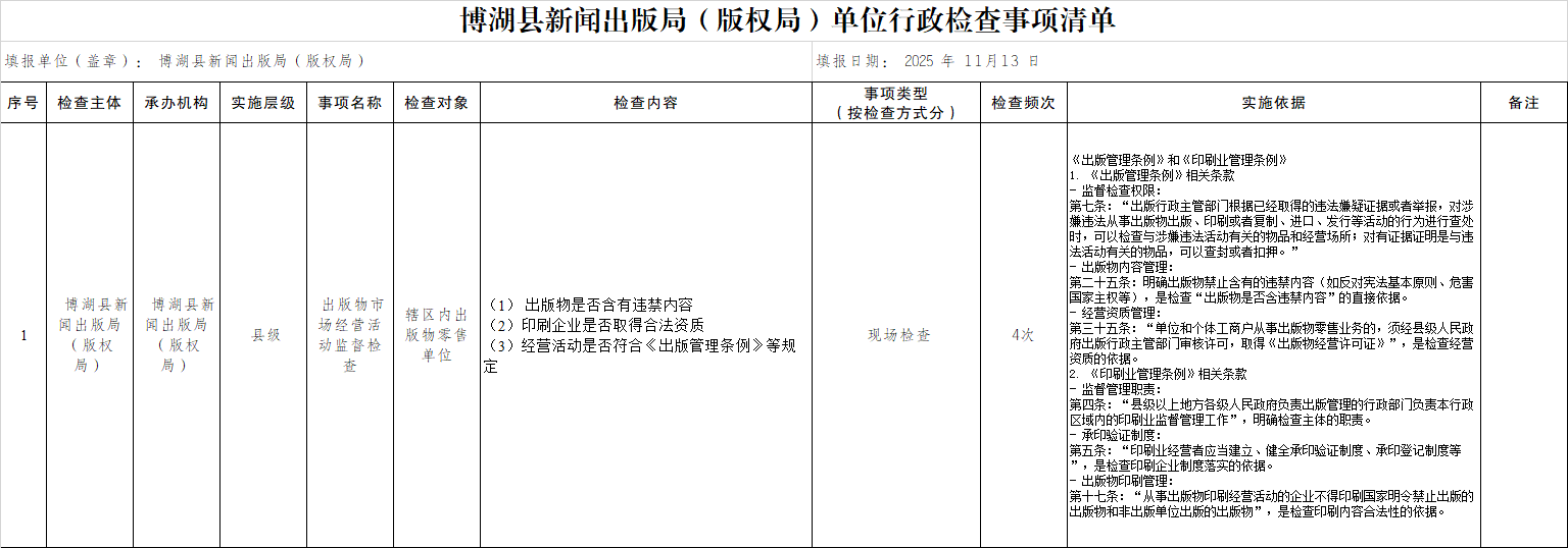 博湖县新闻出版局(版权局)单位行政检查事项清单