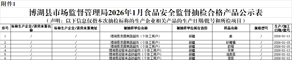 附件1:博湖县市场监督管理局2026年1月食品安全监督抽检合格产品公示表