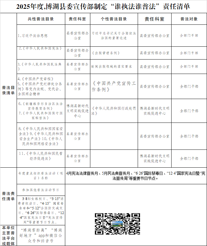 (一)提高政治站位,健全普法责任体系。一是细化责任分工。结合博湖县委宣传部在新闻出版、电影、扫黄打非、意识形态管理等领域的职责。二是夯实队伍履职能力。坚持将提升干部法治素养作为履职前提。将习近平法治思想、宪法、民法典及《中华人民共和国著作权法》《出版管理条例》等行业核心法规纳入理论学习中心组学习、干部培训和支部学习重点内容。全年组织专题法治学习8场。