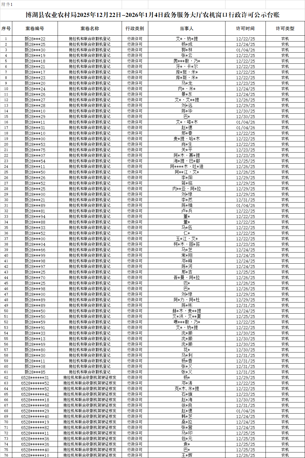 博湖县农业农村局2025年12月22日-2026年1月4日政务服务大厅农机窗口行政许可公示台账