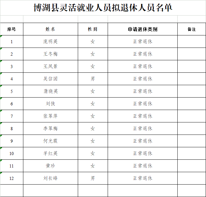 依据《关于渐进式延迟法定退休年龄的办法》、《实施弹性退休制度暂行办法》(人社部发〔2024〕94号)文件精神,根据上级部门关于灵活就业人员退休公示的工作要求,现将庞明英等12名拟办理退休手续人员的有关情况进行公示。公示期自2026年2月25日至3月3日,共7天。在公示期间,如对拟退休人员情况有异议,以书面或电话形式向博湖县人力资源和社会保障局反映。以单位名义反映情况的,应加盖单位公章,以个人名义反映情况的,应署真实姓名和联系电话。公示期满无异议的,将按规定办理退休审批手续;有异议并查实不符合退休条件的,不予办理。