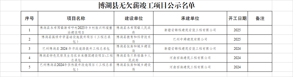 经审查,博湖县本布图镇新布呼村2025年乡村振兴环境整治建设项目等5个项目提交了无欠薪承诺书,申请项目完工,现对其无拖欠农民工工资情况进行公示(具体项目信息详见附件)