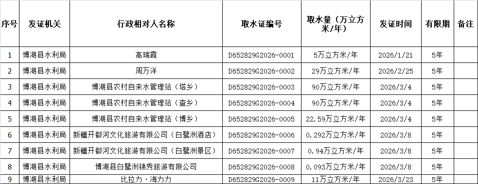 博湖县水利局取水许可证办理公示(第一季度)