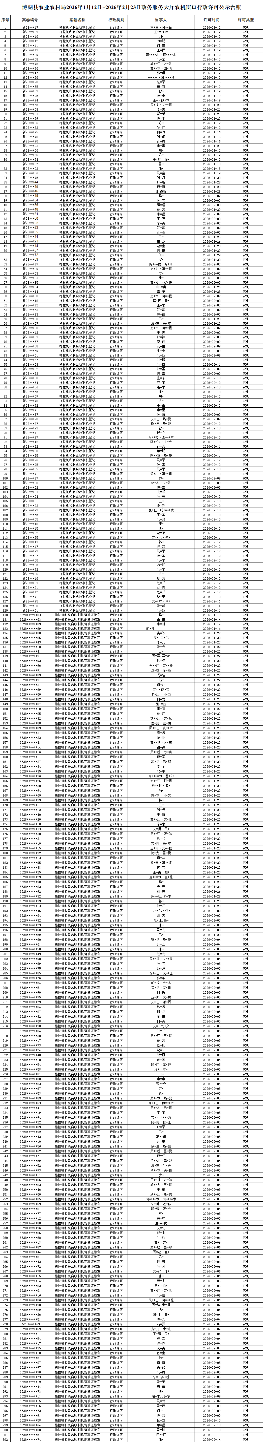 博湖县农业农村局2026年1月12日-2026年2月23日政务服务大厅农机窗口行政许可公示台账