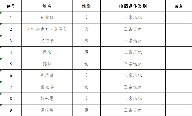 依据《关于渐进式延迟法定退休年龄的办法》《实施弹性退休制度暂行办法》(人社部发〔2024〕94号)文件精神,根据上级部门关于灵活就业人员退休公示的工作要求,现将孙继珍等9名拟办理退休手续人员的有关情况进行公示。公示期自2026年3月18日至3月25日,共8天。在公示期间,如对拟退休人员情况有异议,请以书面或电话形式向博湖县人力资源和社会保障局反映。以单位名义反映情况的,应加盖单位公章,以个人名义反映情况的,应署真实姓名和联系电话。公示期满无异议的,将按规定办理退休审批手续;有异议并查实不符合退休条件的,不予办理。