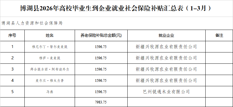 4月8日将博湖县2026年企业就业高校毕业生社保补贴人员名单进行公示,符合企业就业高校毕业生社会保险补贴发放条件的共5人,申请补贴资金7983.75元。