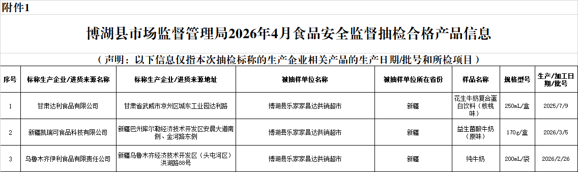 根据《中华人民共和国食品安全法》和《2026年博湖县市场监督管理局食品安全监督抽检计划》的要求,2026年4月博湖县市场监督管理局委托新疆西域质信检验检测有限公司对全县范围内生产经营的3批次食品开展了监督抽检。